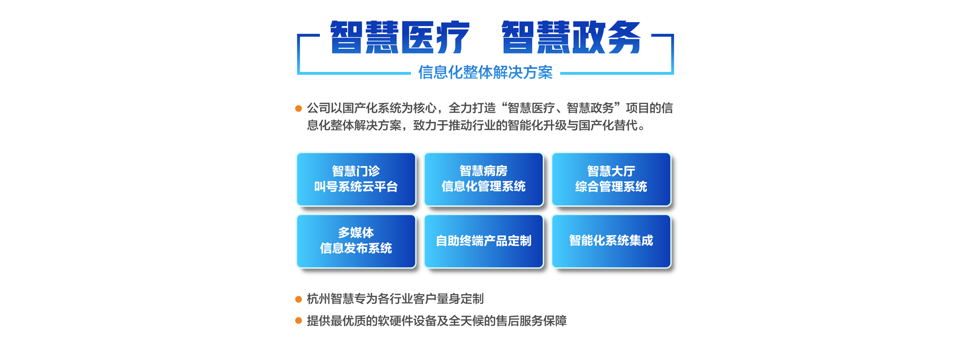 杭州智慧科技有限公司初創(chuàng)于2003年,總部位于重要的電子商務(wù)中心中國(guó)杭州公司主營(yíng)業(yè)務(wù)有:智慧分診叫號(hào)系統(tǒng)、智慧病房醫(yī)護(hù)對(duì)講系統(tǒng)、智慧大廳綜合管理系統(tǒng)、智慧政務(wù)管理系統(tǒng)、智慧多媒體信息發(fā)布系統(tǒng)、導(dǎo)診系統(tǒng)及各自助終端產(chǎn)品定制。專為各行業(yè)客戶量身定制。公司已有20余年行業(yè)經(jīng)驗(yàn)沉淀積累,擁有優(yōu)秀的產(chǎn)品外觀設(shè)計(jì)師和各類中高級(jí)專業(yè)技術(shù)工程師,確保所研發(fā)的產(chǎn)品具有行業(yè)領(lǐng)先的外觀及可靠的技術(shù)性能。并擁有權(quán)威部門(mén)頒發(fā)的各類知識(shí)產(chǎn)權(quán)及專利證書(shū),30多項(xiàng)資質(zhì)證書(shū)、800多個(gè)合作伙伴、2000多個(gè)項(xiàng)目成功案例經(jīng)驗(yàn)。 智慧產(chǎn)品已遍及全國(guó)各醫(yī)療、政務(wù)、金融、通訊、公安、工商、稅務(wù)等行業(yè),形成以“立足杭州、輻射長(zhǎng)三角、拓展全國(guó)”的戰(zhàn)略發(fā)展格局,產(chǎn)品經(jīng)過(guò)歷年不斷創(chuàng)新,形成專業(yè)化、平臺(tái)化,致力于成為智慧產(chǎn)品的領(lǐng)軍企業(yè)。 公司建立了完善的技術(shù)培訓(xùn)及售后服務(wù)中心,并設(shè)24小時(shí)熱線咨詢電話解答用戶反饋的問(wèn)題。同時(shí)應(yīng)客戶要求定期派技術(shù)人員到 全國(guó)各地進(jìn)行技術(shù)指導(dǎo)輔助用戶正確使用智慧產(chǎn)品并能獨(dú)立安裝、調(diào)試、日常維護(hù)等工作。提供最優(yōu)質(zhì)的設(shè)備及全天候的售后服務(wù)保障,智慧永恒不變的服務(wù)宗旨——致力于客戶的滿意與成功!...